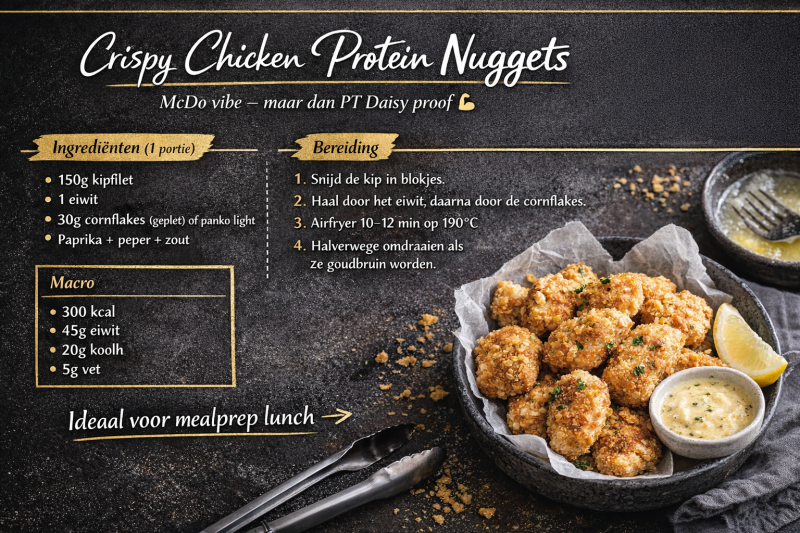 Gezond eten hoeft niet moeilijk of saai te zijn. Op deze pagina vind je eenvoudige, lekkere en eiwitrijke recepten die perfect passen binnen een gezonde levensstijl en een traject naar vetverlies. De recepten zijn gebalanceerd, voedzaam en makkelijk te maken, zodat je kan genieten van je maaltijden en tegelijk werken aan je doelen. Van ontbijt en lunch tot avondmaaltijden en snacks: hier vind je inspiratie om elke dag bewust en lekker te eten. Voel je fit. Straal van binnen en buiten. 💪